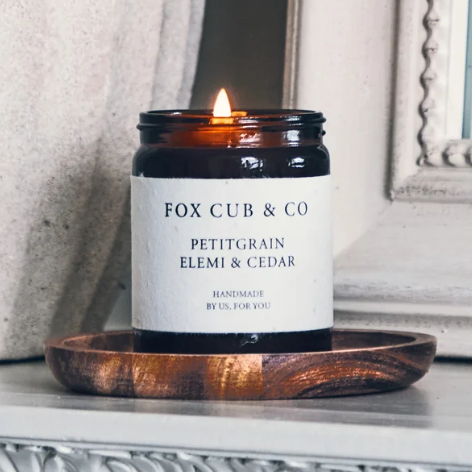 Fox Cub & Co’s Petitgrain Elemi & Cedar candle offers a refined blend of citrusy petitgrain, crisp elemi resin, and smooth cedarwood.