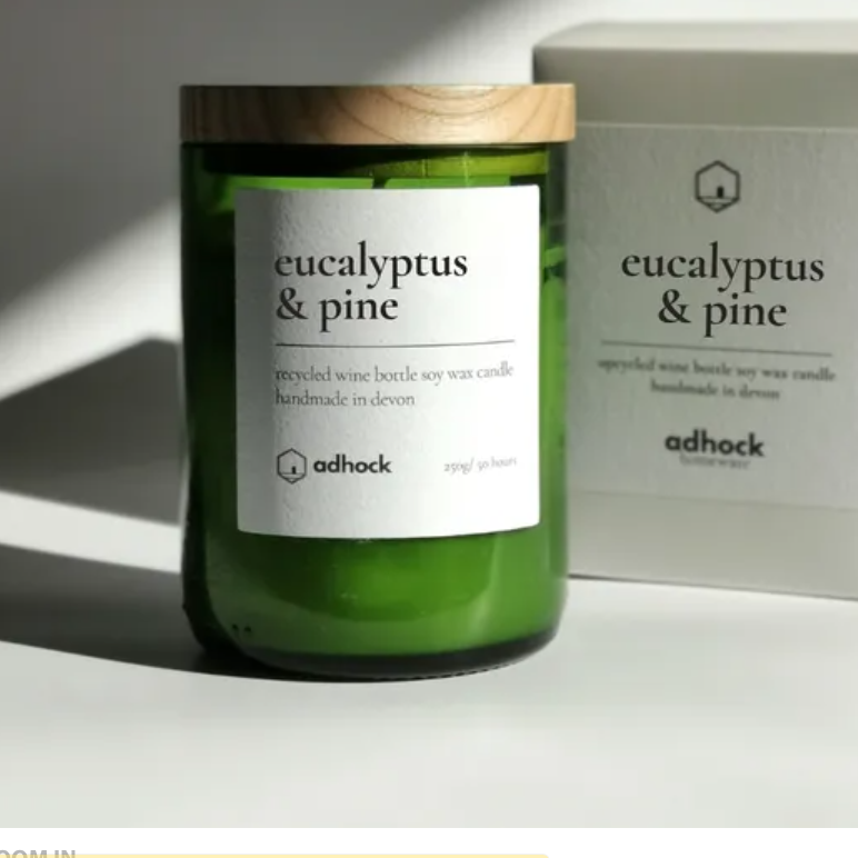 Expertly handcrafted from upcycled wine bottles, the Adhock Eucalyptus & Pine Wine Bottle Candle offers a sustainable and elegant way to enjoy seasonal aromas.