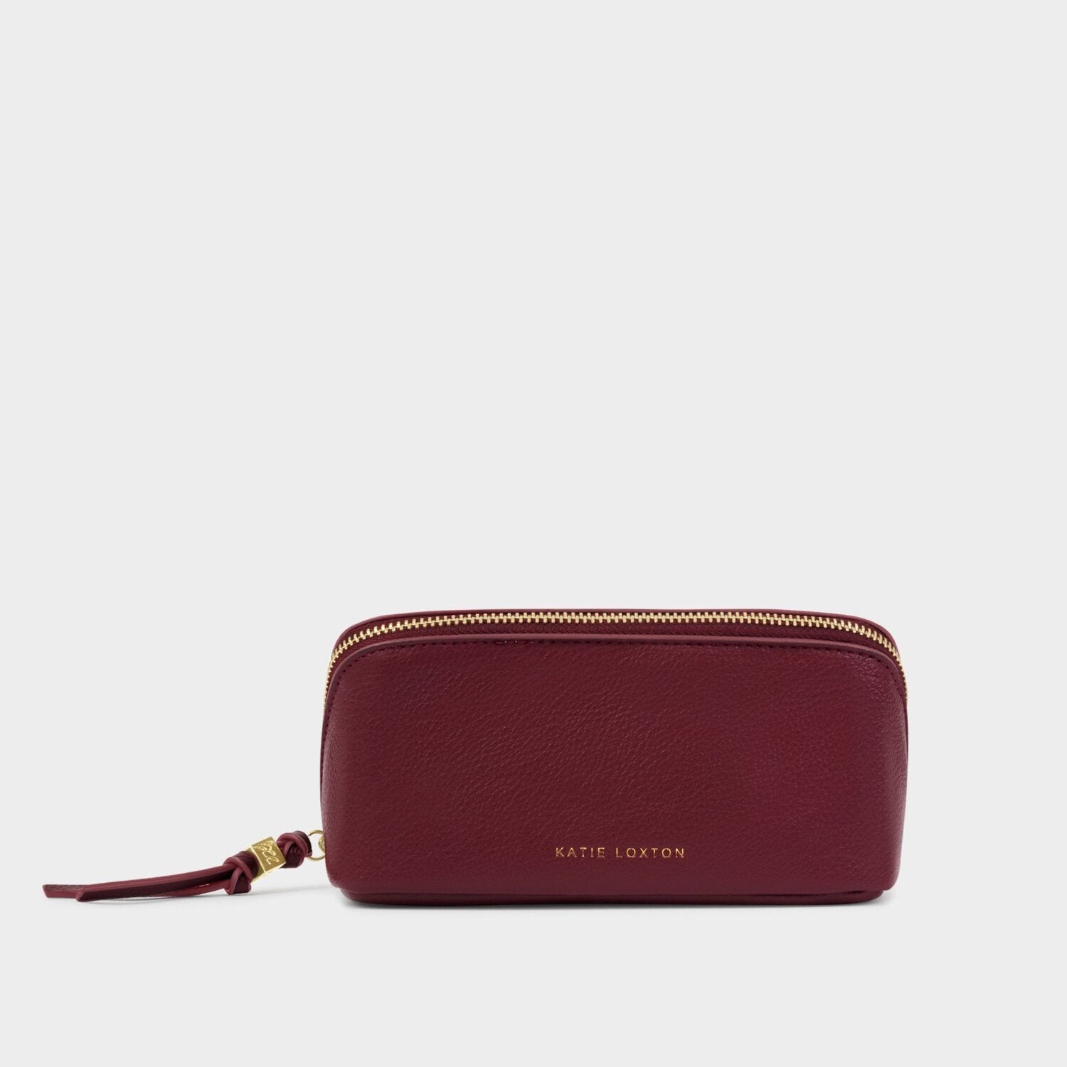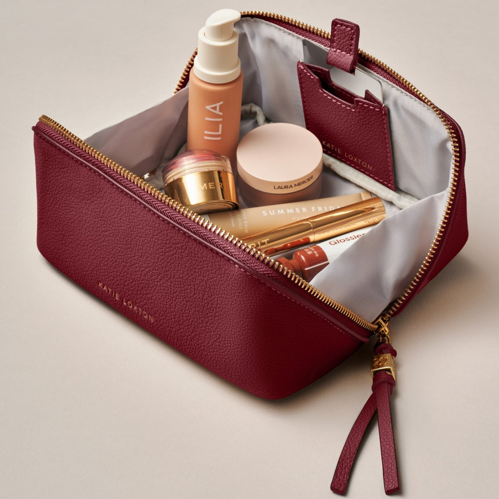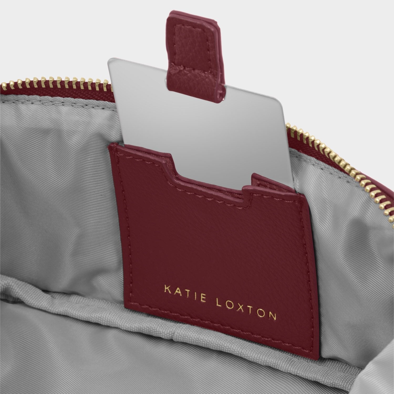 The Katie Loxton Fold-Out Mirror Make Up Bag in Cherry combines smooth vegan leather with sophisticated gold-tone hardware for a chic, ethical accessory.