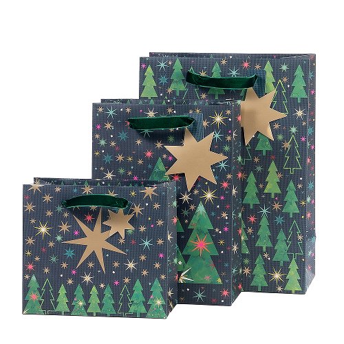Featuring a bold and festive navy background adorned with playful green trees, this large gift bag is perfect for Christmas gifts.