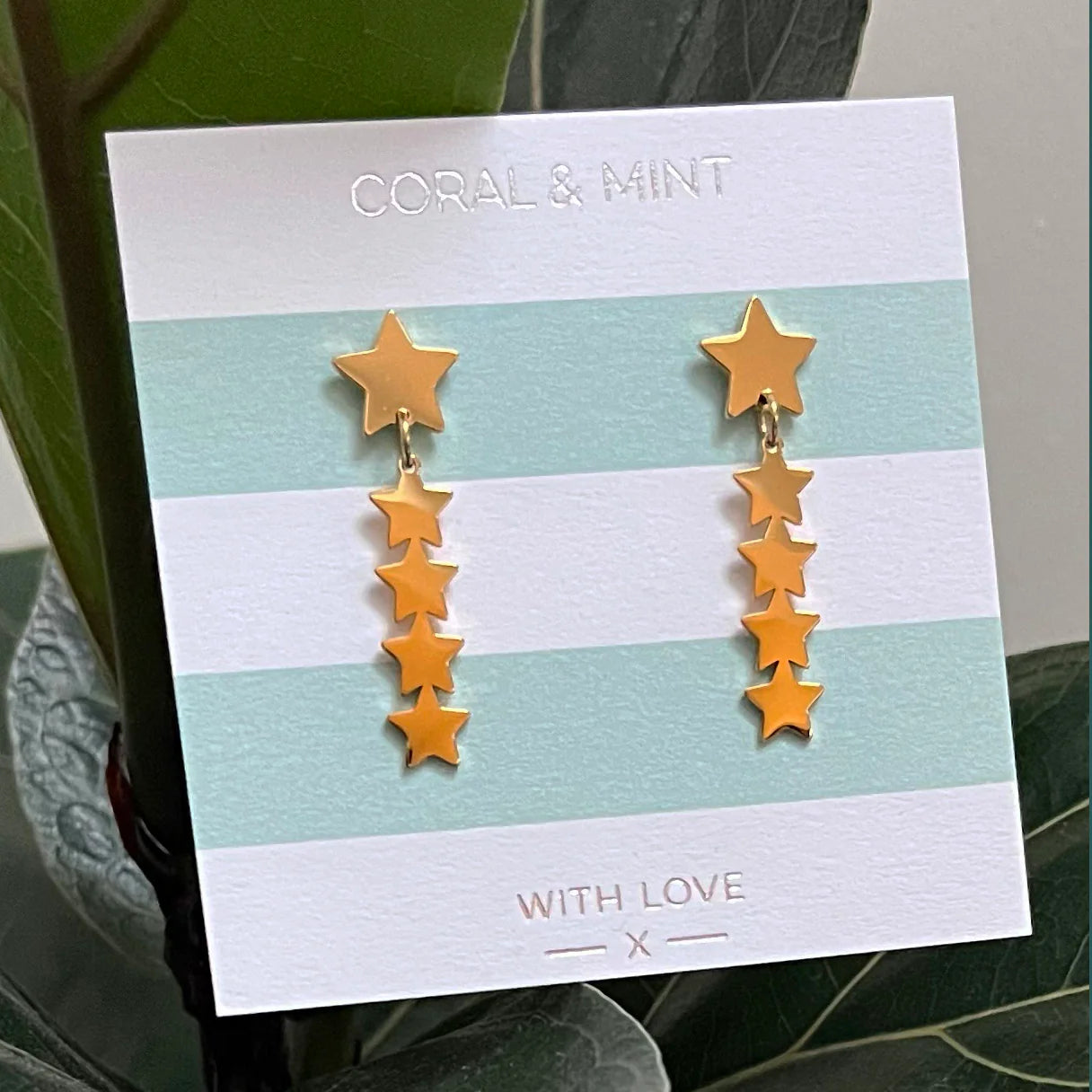 Expertly crafted with gold plated stainless steel, these Coral & Mint - Gold Star Drop Earrings are perfect for making a statement from day to night.