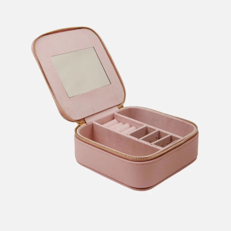 This travel-friendly kit features a double-zipped lid with mirror insert, faux suede lining, and spacious compartments for all your earrings, rings, and baubles.