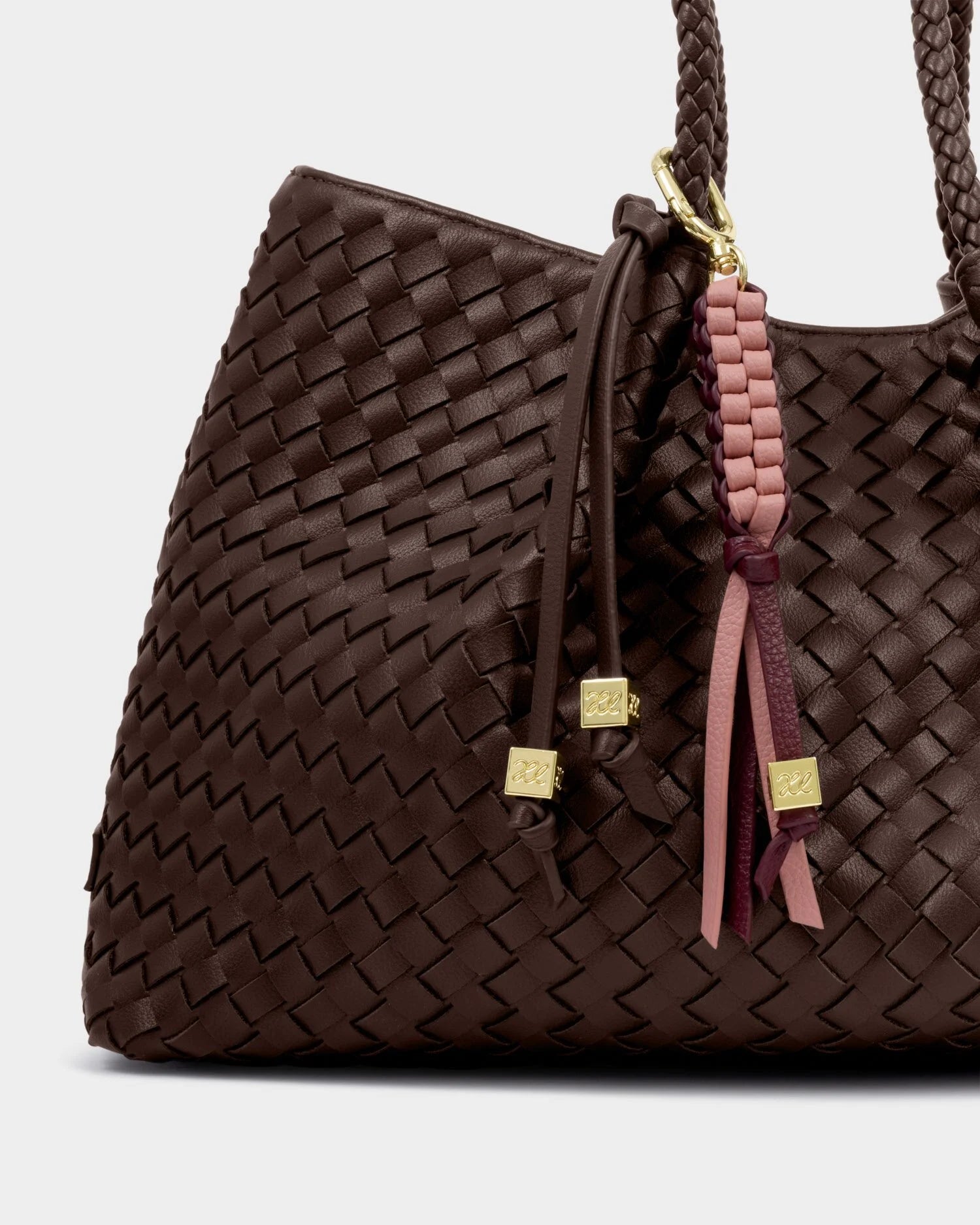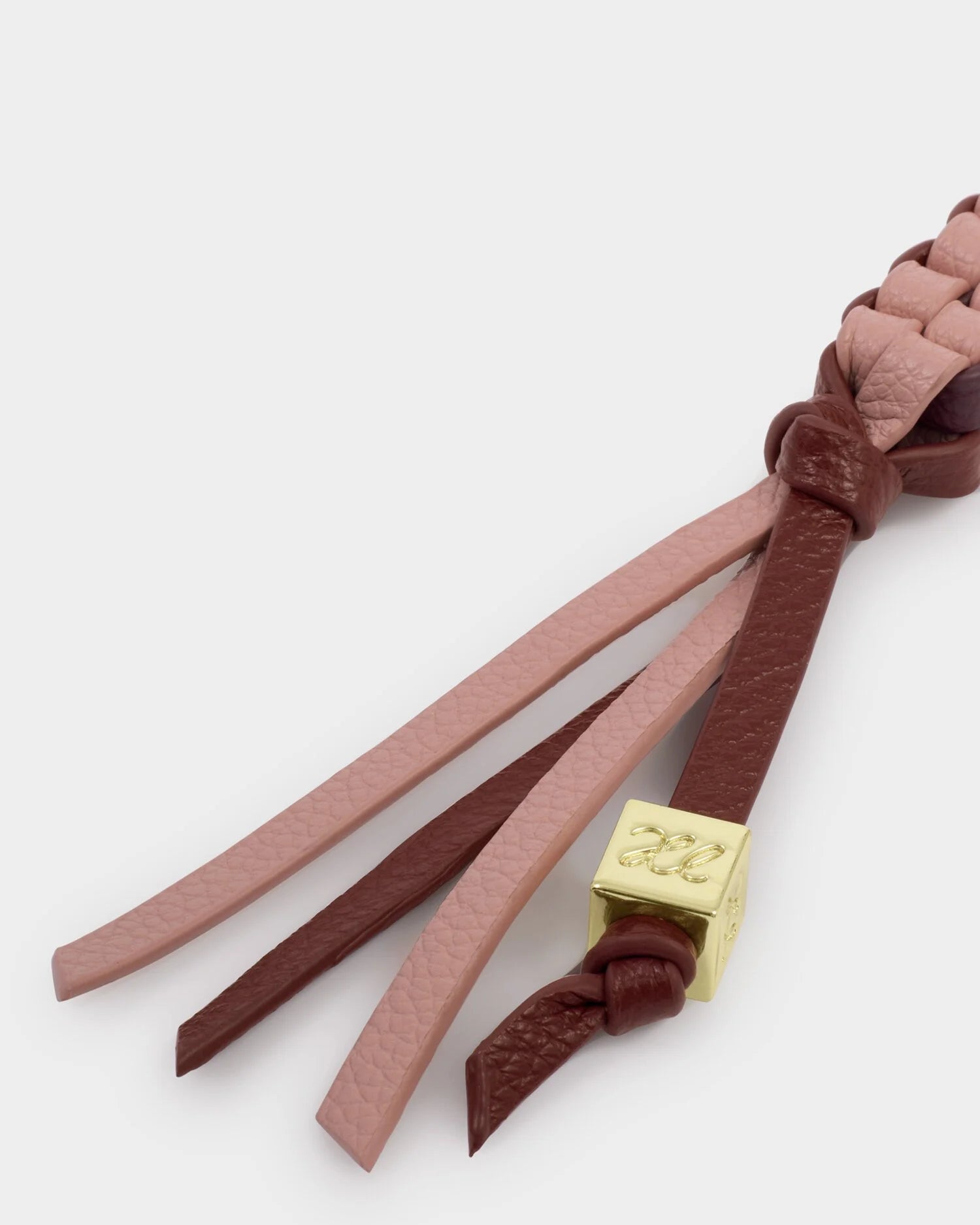 The Braided Keyring Bag Charm features expertly crafted braided vegan leather in a captivating rose pink and cherry colour combination.