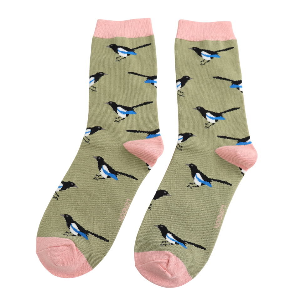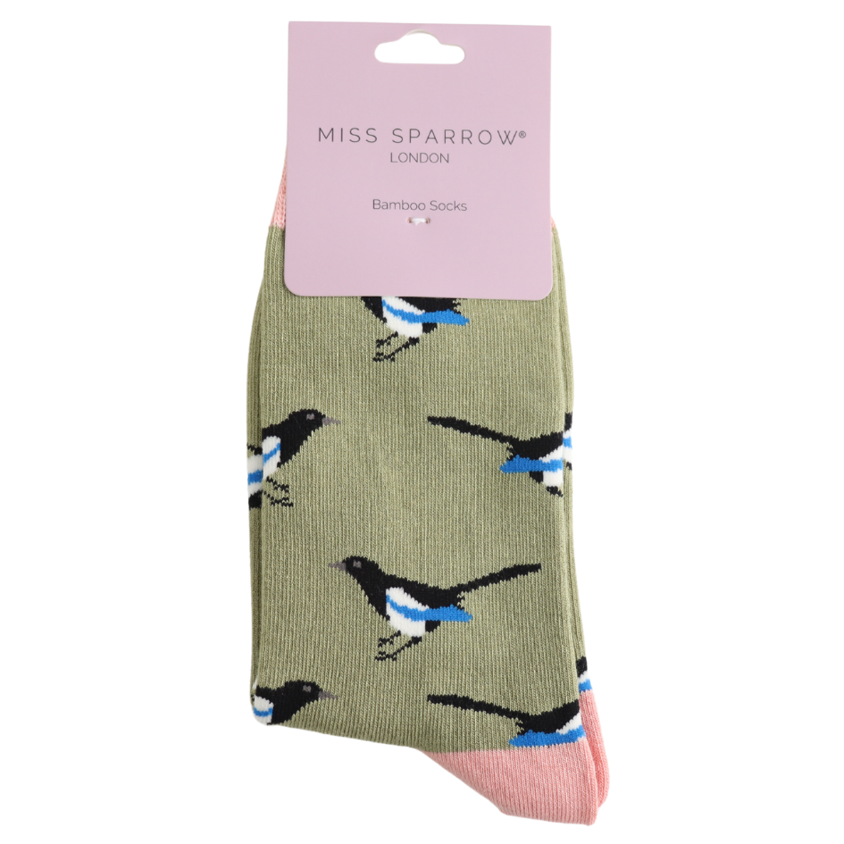Discover the understated elegance of Miss Sparrow's magpie-adorned socks in a calming moss tone.