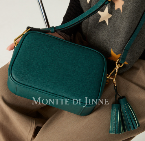 This stylish bag has a detachable tassel key ring and leather strap, gold metal hardware, a zipper closure and two internal pockets.
