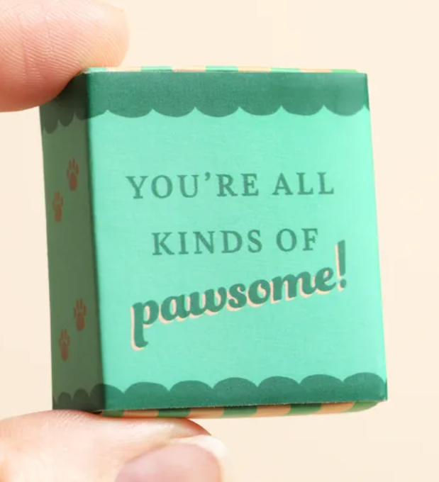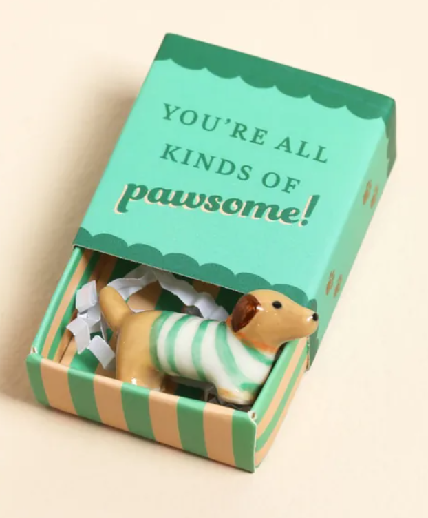 Presented in a coordinating blue matchbox emblazoned with the affectionate message "You're all kinds of pawsome," this miniature piece combines playful design with genuine sentiment. The thoughtful pairing of whimsical detail and heartfelt messaging creates a memorable keepsake perfect for friends, children, or devoted canine lovers. A delightful gift that celebrates the joy and companionship our four-legged friends bring to our lives.