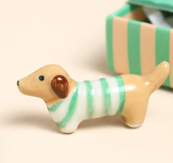 Delight any dog enthusiast with this endearing ceramic sausage dog token, meticulously crafted in warm tan with contrasting dark brown ears and a charming blue and white striped jumper.