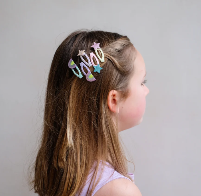 Featuring a striking rainbow and star design, these mini clips deliver sparkle without bulk, making them particularly suited to fine or delicate hair. Whether for celebrations or everyday wear, they provide secure hold with a lightweight feel. A thoughtfully designed accessory that brings colour and charm to any hairstyle while prioritising comfort for younger wearers.