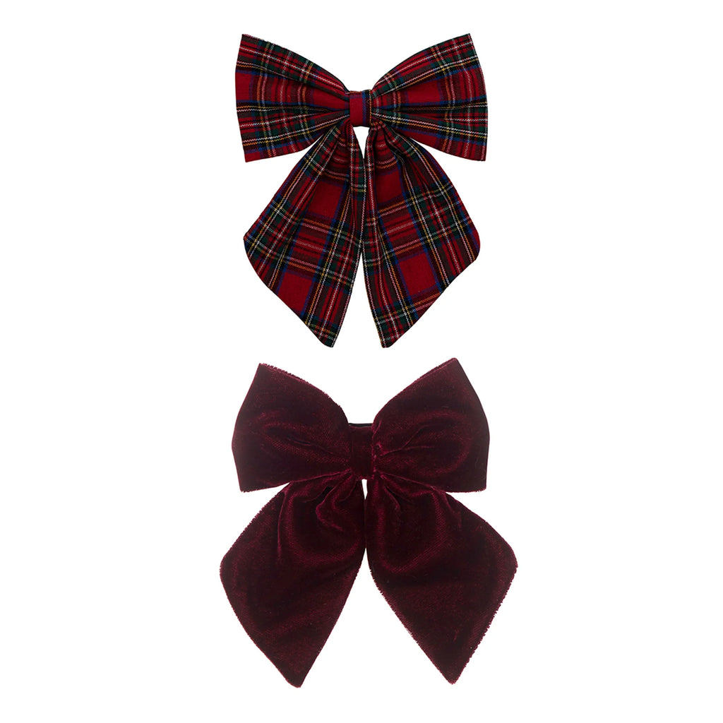 The beloved Agnes Bow Clips return in a stunning winter edition, featuring deep burgundy velvet and classic rich tartan prints.