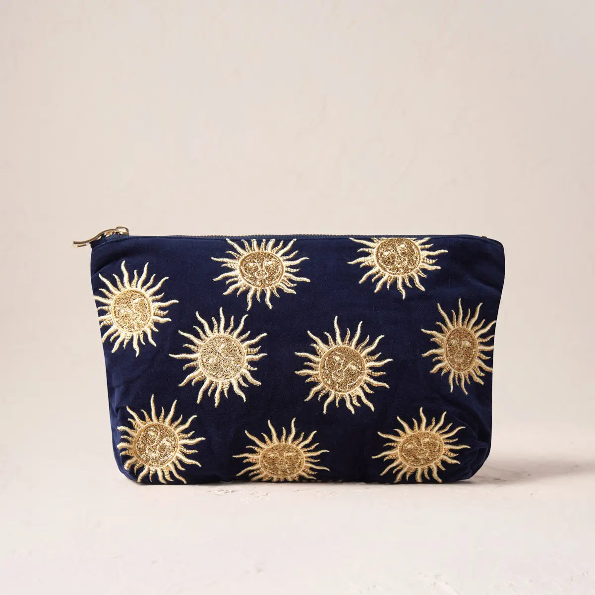 Celebrate the sun's radiant energy with this everyday pouch, featuring Elizabeth's distinctive hand-drawn sun character embroidered in gleaming gold and vanilla threads on luxurious navy velvet.