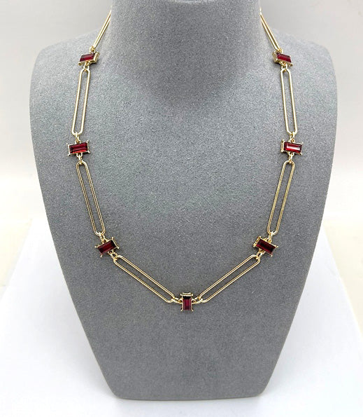 Isles & Stars - Red Acrylic Stone Accent on Unique Link Brass Chain Necklace - Gold