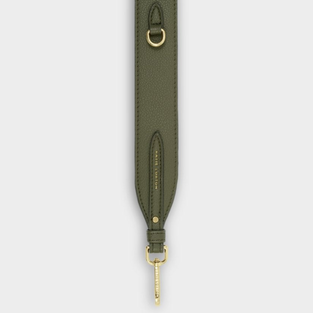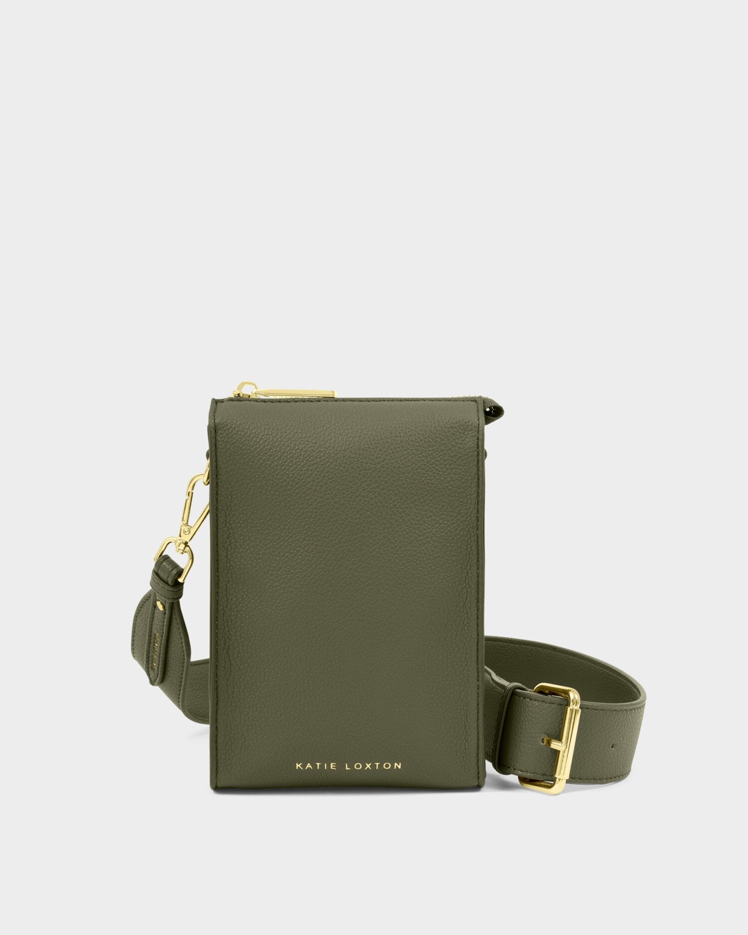 The Katie Loxton Avery Slim Crossbody Bag in Khaki features smooth vegan leather with a soft suedette lining, combining luxury with ethical design.