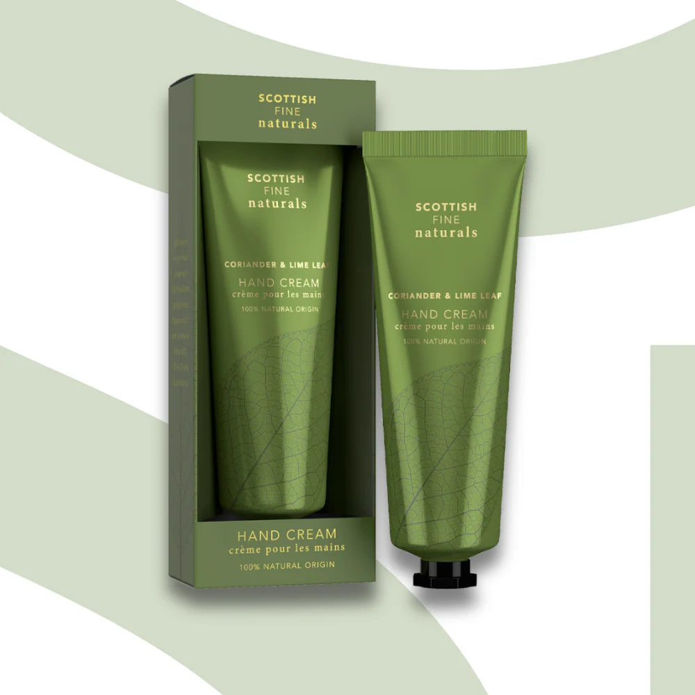 Scottish Fine Soaps - Coriander & Lime Leaf Hand Cream 75ml Indulge your hands with this luxuriously nourishing cream, enriched with 10% Shea Butter and a carefully selected blend of locally farmed Rapeseed Oil, Almond Oil, and Olive Oil.