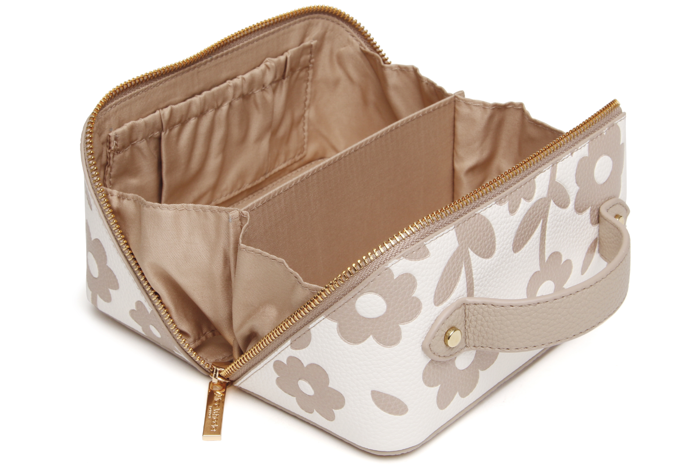 This stone floral mini train case features a gold toned metal zip and wide opening, revealing a fully lined compartment with internal pockets. Keep all of your beauty essentials organised and easily accessible in style.