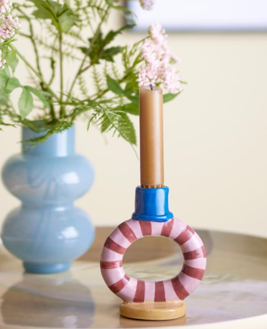 Hand-painted stripes create a playful, artistic character—no two are exactly alike. Display solo as a bold statement or group several together for layered ambiance. Perfect for adding colour and warmth to any room.