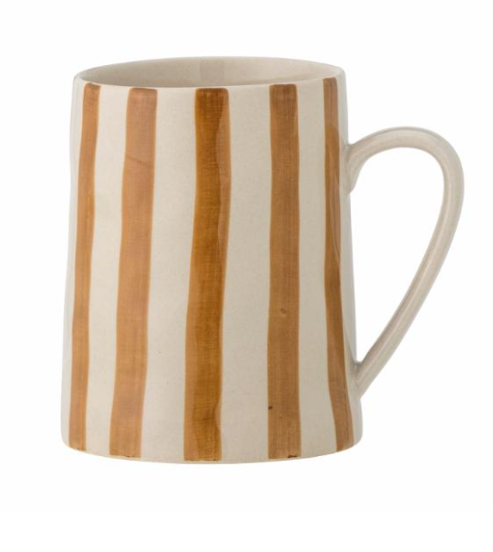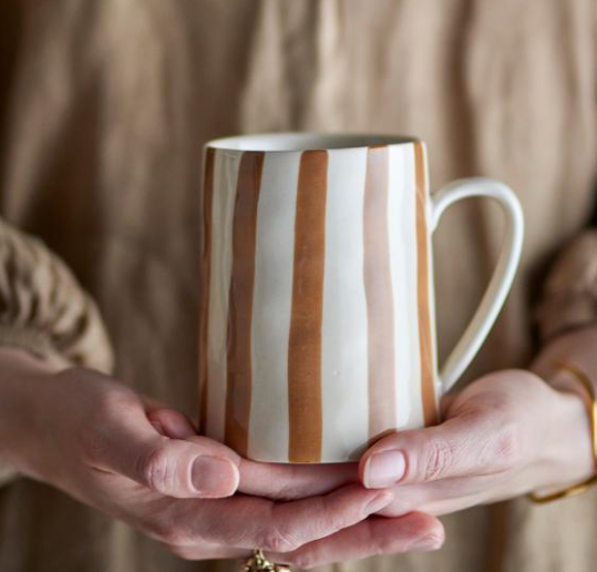 Handcrafted stoneware mug featuring a distinctive striped pattern, each piece uniquely hand-painted for individual character.