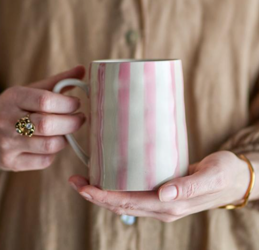 Crafted from durable stoneware, this Begonia Mug features a hand-painted striped pattern in soft dusty rose.