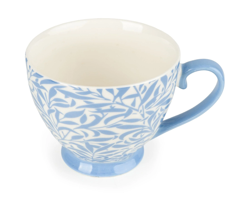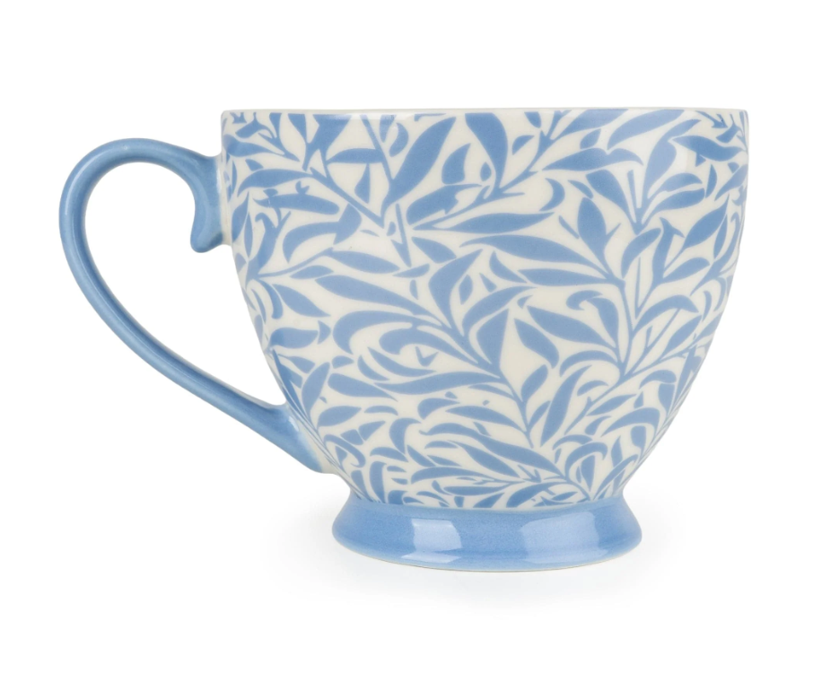 The all-over vine motif rendered in soft sky tones against warm ivory creates visual sophistication, whilst the pedestal foot introduces a subtle decorative element that distinguishes it from standard mugs. The smooth glazed finish enhances pattern clarity and provides a pleasing tactile quality, and the ergonomic handle ensures comfortable, balanced handling. Banks' design approach—merging accessible affordability with understated elegance—is evident throughout, making this mug equally effective as a standalone piece or as part of the coordinated Leafy Trellis collection for a cohesive table aesthetic.