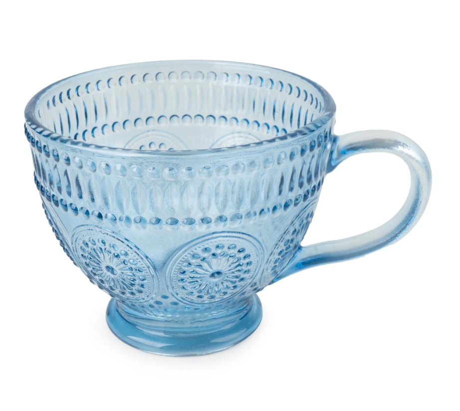 This 8.9cm pressed glass mug showcases intricate circular and radial motifs characteristic of vintage glasswork, rendered in a striking blue tone.