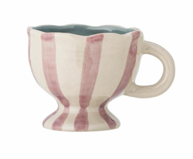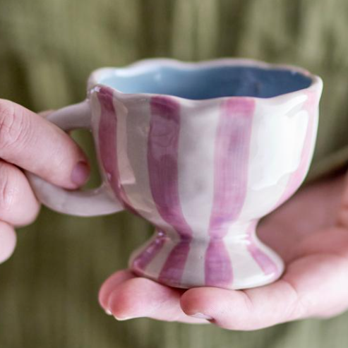 Each cup features delicate hand-painted stripes in soft rose and blue tones, ensuring no two are identical. The scalloped rim and elegant pedestal base create a refined silhouette, while the comfortable handle makes it perfect for everyday use or display. Whether you're sipping your morning coffee or showcasing it on a shelf, this versatile cup adds a touch of Scandinavian-inspired elegance to any space.