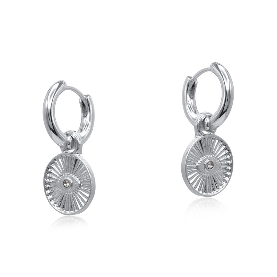 These handcrafted Circle Evil Eye Earrings from Big Metal London showcase a textured silver charm featuring a radiant eye design with a subtle crystal centre.