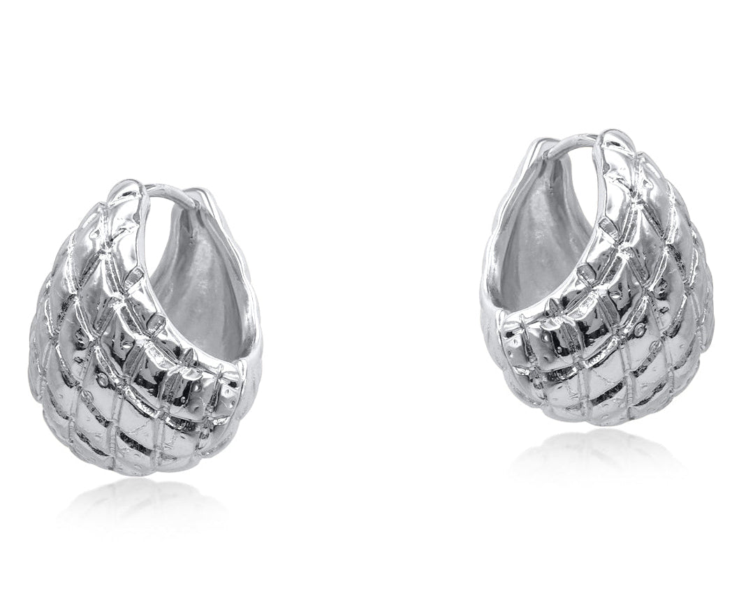 These handcrafted Acorn Hoop Earrings in silver feature a sculptural, quilted texture paired with a rounded, drop-like silhouette for a bold yet refined statement.