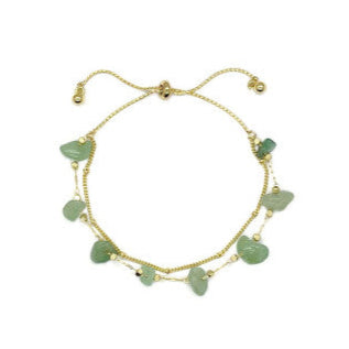 Made with gold plated brass and adorned with green stones, this bracelet brings summer vibes to any outfit. The adjustable design makes it a perfect fit for anyone, making it a thoughtful gift for any occasion.