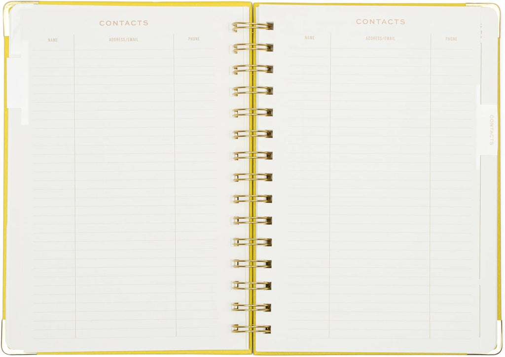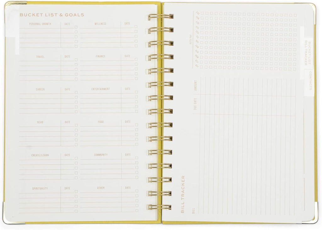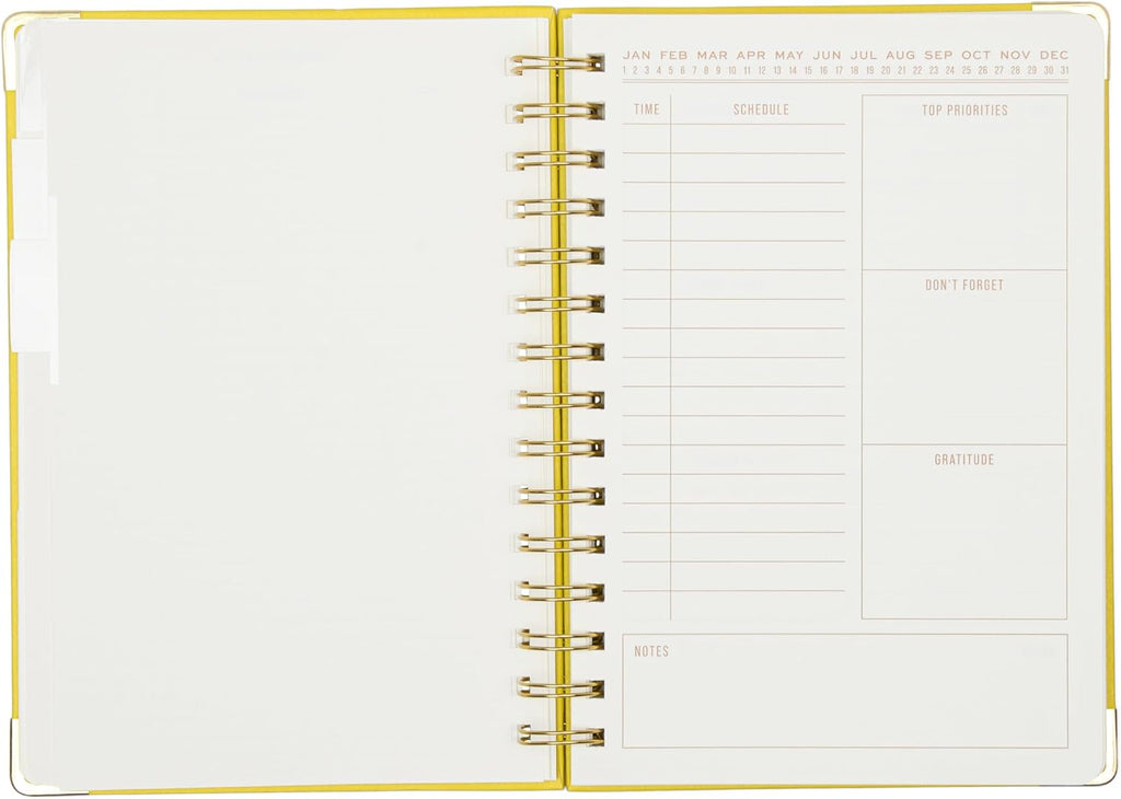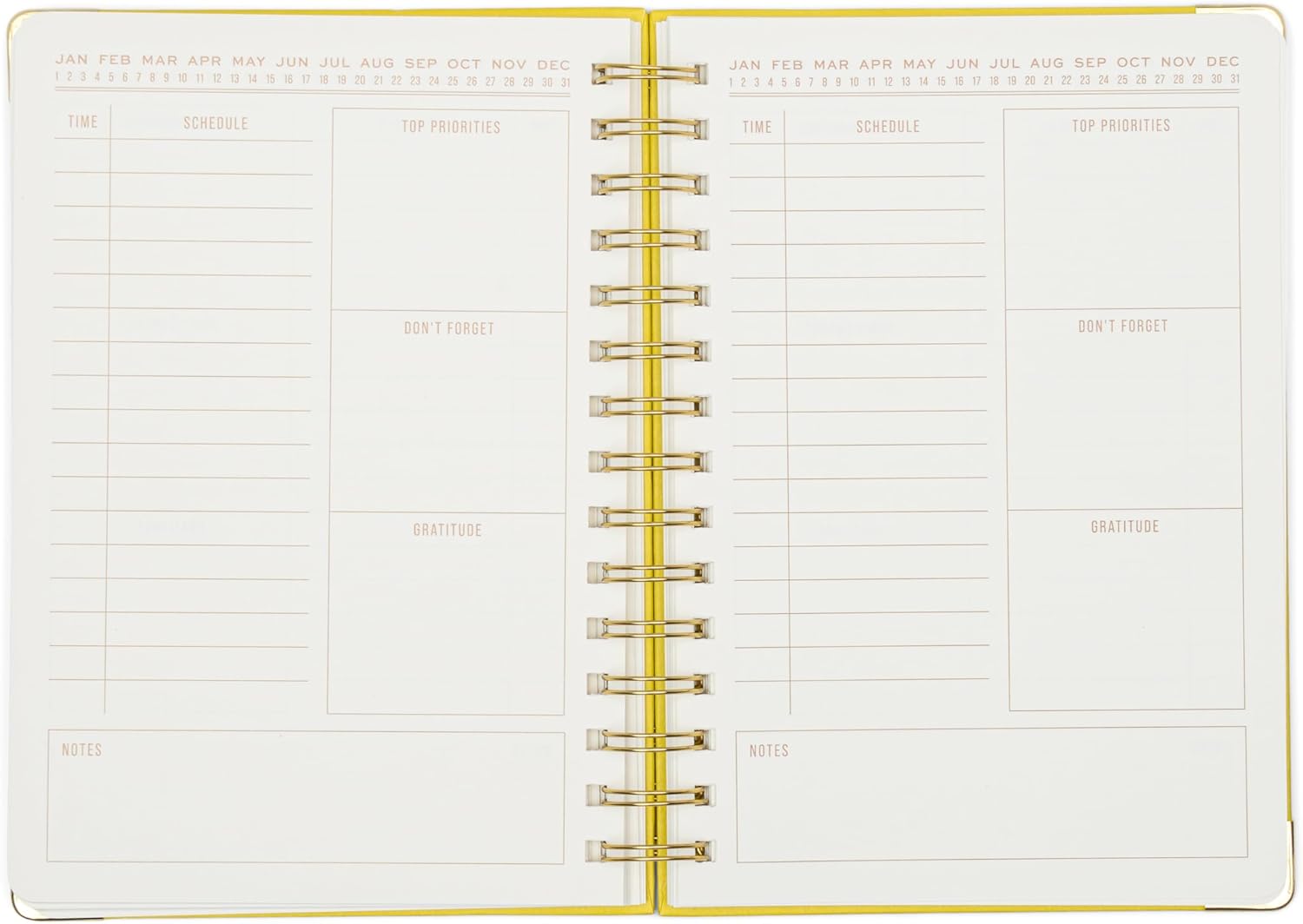 Its vibrant design brings joy while fill-in-the-date pages and daily highlight tracking keep you organised. The wirebound planner features a hardback cover, metal corner protectors, and a chic gold finish for durability.
