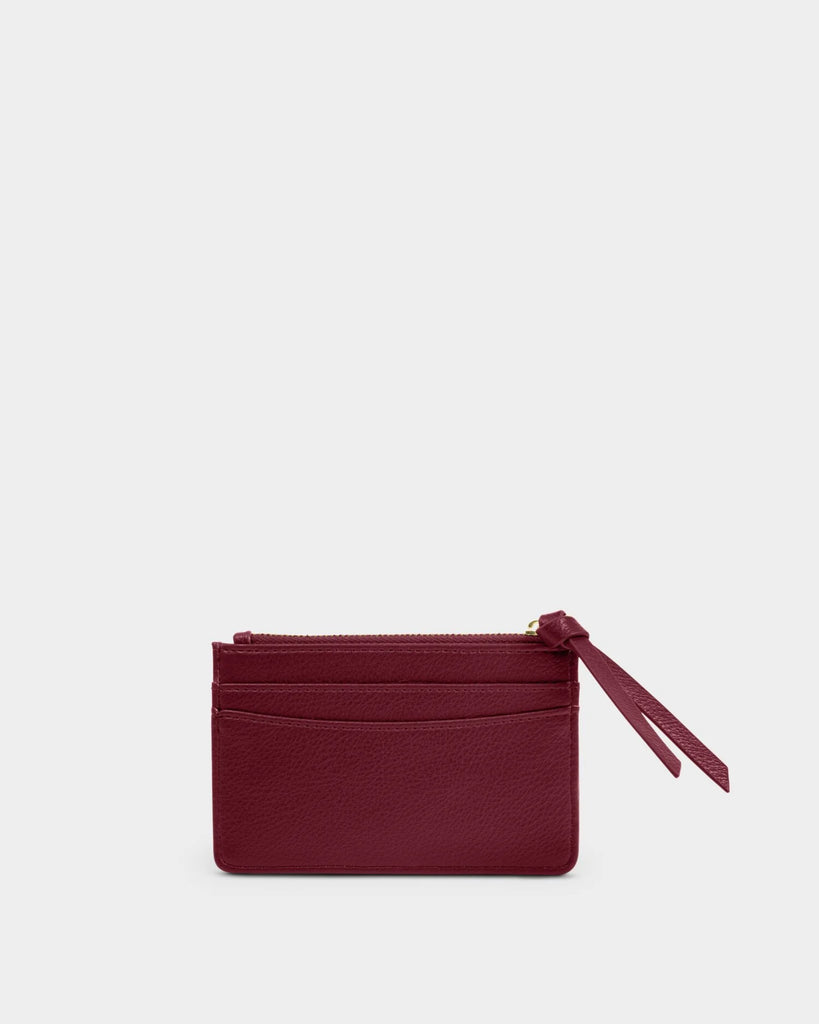 The Katie Loxton Hallie Coin & Card Holder in Cherry features a smooth pebble vegan leather exterior paired with a recycled polyester lining, combining style with sustainability.