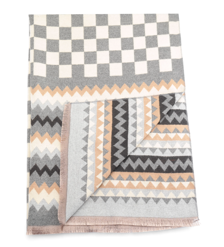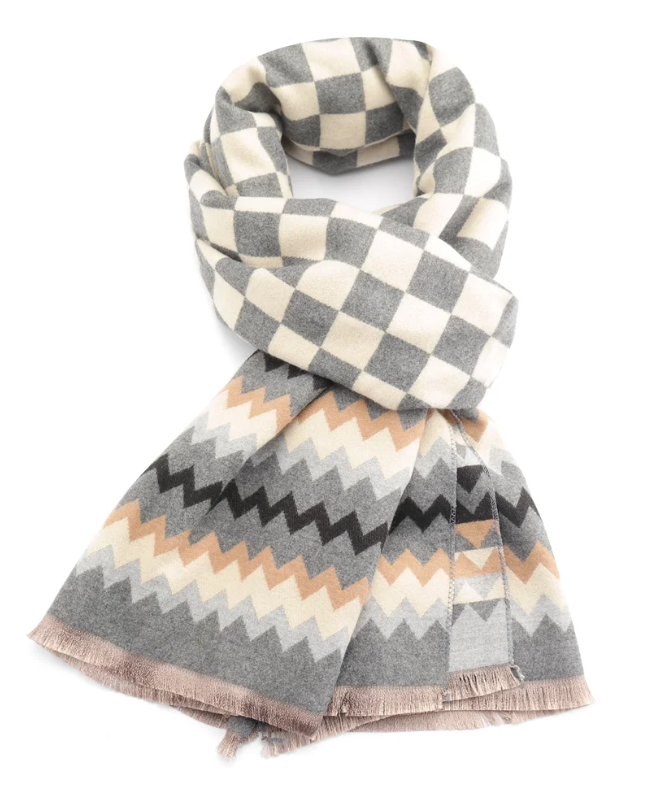 Featuring a striking geometric pattern that adds visual interest without overwhelming, this scarf strikes the perfect balance between contemporary design and timeless appeal. Expertly constructed to provide substantial warmth, it's an essential layer for winter dressing. The neutral grey tone pairs seamlessly with virtually any outfit, from everyday wear to special occasions. Luxuriously soft and generously proportioned, it delivers the cosy comfort you'll reach for repeatedly throughout the season. An excellent gift choice for those who value quality, understated sophistication, and practical elegance in their accessories.