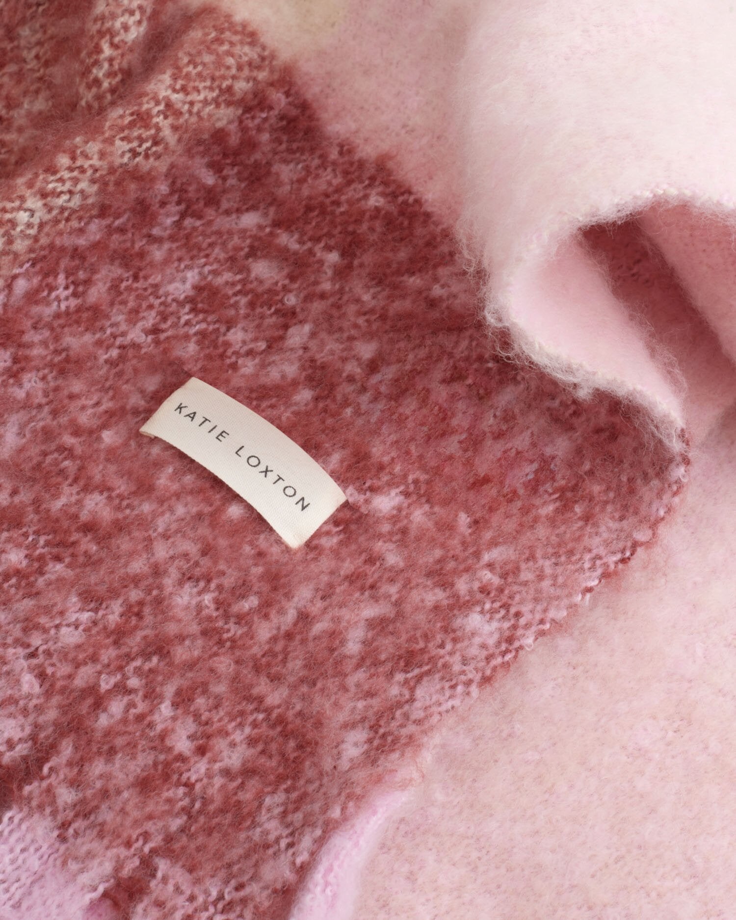 The Katie Loxton Recycled Tassel Scarf in pink, burgundy, and cream is crafted from soft, brushed recycled polyester, ensuring warmth and comfort.