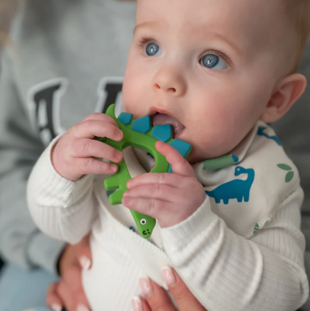 Designed to comfort teething babies, this dinosaur-shaped silicone teether features soft, soothing textures that ease sore gums.
