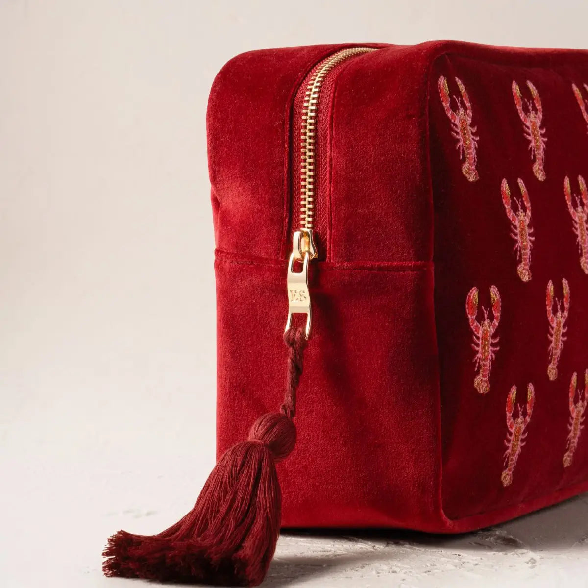 The sumptuous rouge velvet canvas showcases delicate embroidered lobster motifs, making it equally at home displayed on your bathroom shelf or tucked into your travel luggage. An elegant zip tassel adds a refined finishing touch, whilst the waterproof lining safeguards your skincare essentials from spills and moisture. Thoughtfully designed inner pockets compartmentalise products for easy access, whether you're a devoted skincare enthusiast or frequent traveller. A meaningful Valentine's gift for someone special, or a charming treat for yourself—this piece seamlessly blends beauty with utility.