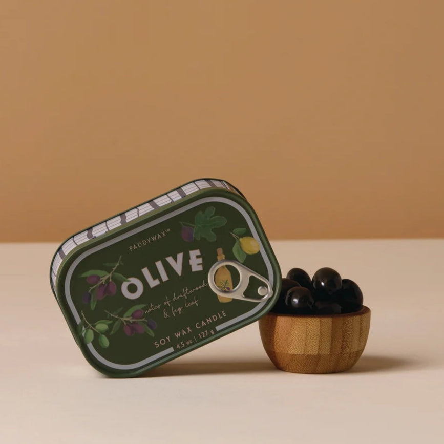 Introducing Paddywax Bistro Olive Printed Tin Candle.