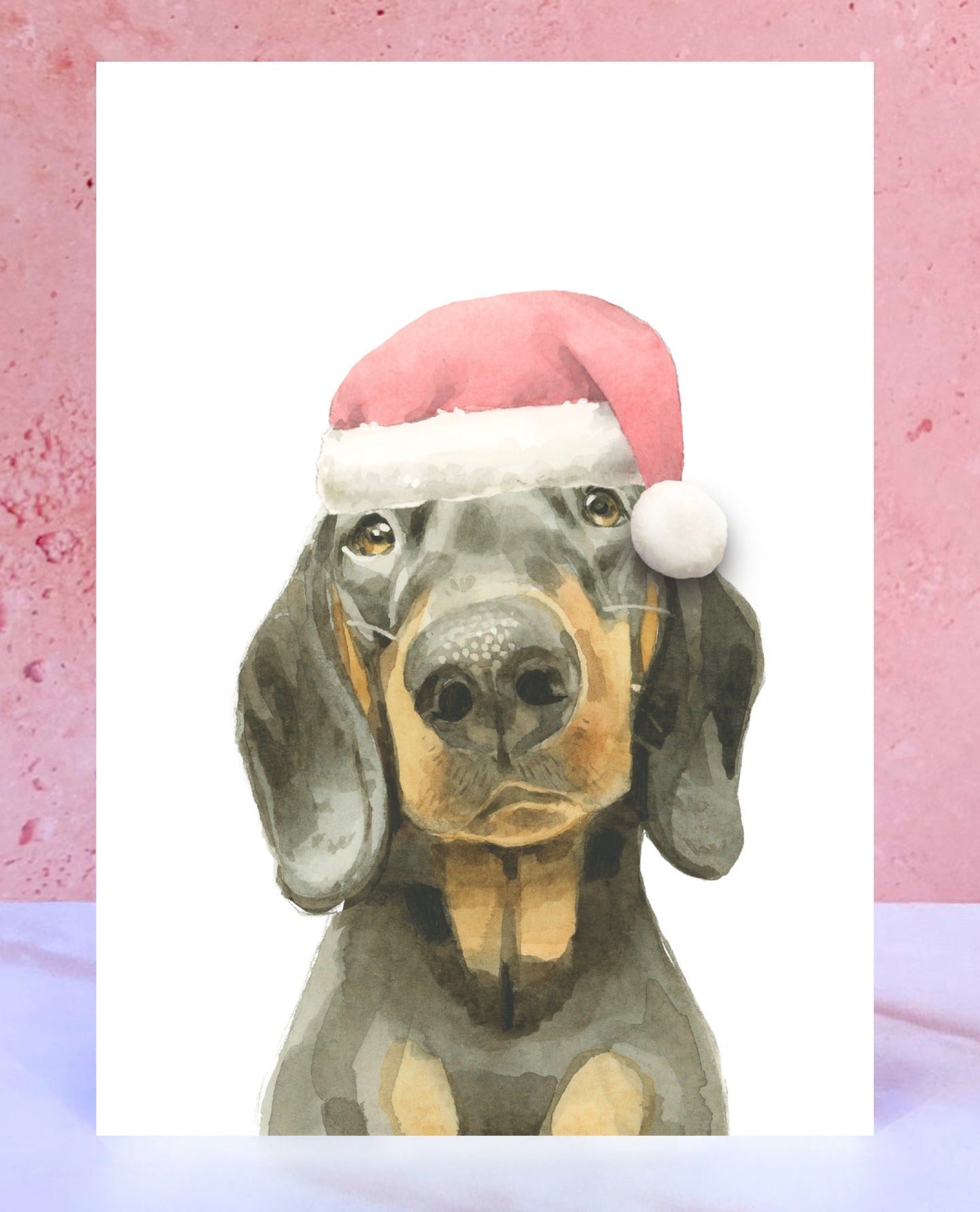 Show your pup-loving pals some extra love this year with this one-of-a-kind Black & Tan Dachshund Pompom Santa Hat card!
