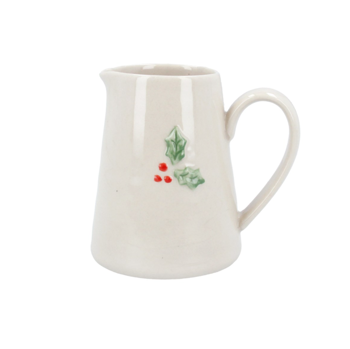 The Gisela Graham Ceramic Mini Jug features a charming holly design, perfect for adding a festive touch to your Christmas table or kitchen.