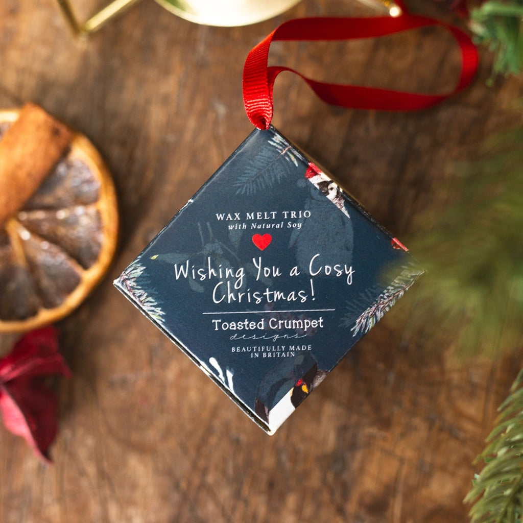 Introducing the Toasted Crumpet Christmas Penguins wax melt hanging decoration.