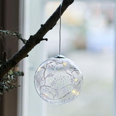Cosy LED glass hanging ball with 5 LEDs. The battery is hidden in a uniquely designed battery holder.