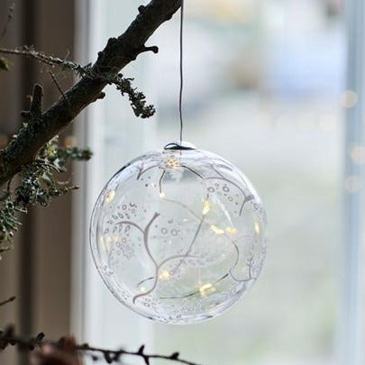 Cosy LED glass hanging ball with 8 LEDs. The battery is hidden in a uniquely designed battery holder.