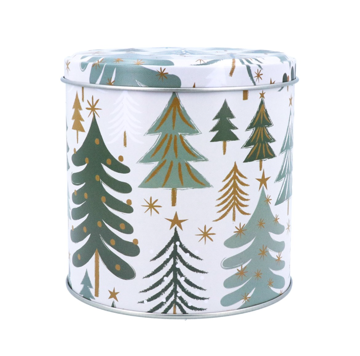 Its decorative design featuring cream and green trees adds seasonal elegance, while its sturdy construction ensures it’s perfect for gifting or storing festive treats. This tin brings both style and function to your festive celebrations.