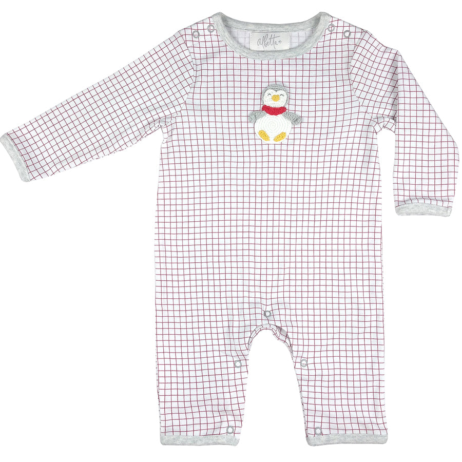 Made from the softest modern red and white grid design cotton, it has a sweet hand-crocheted penguin on the front, complete with a friendly face, fun little 3D wings and a sweet red scarf. Perfect for little boys and girls alike.