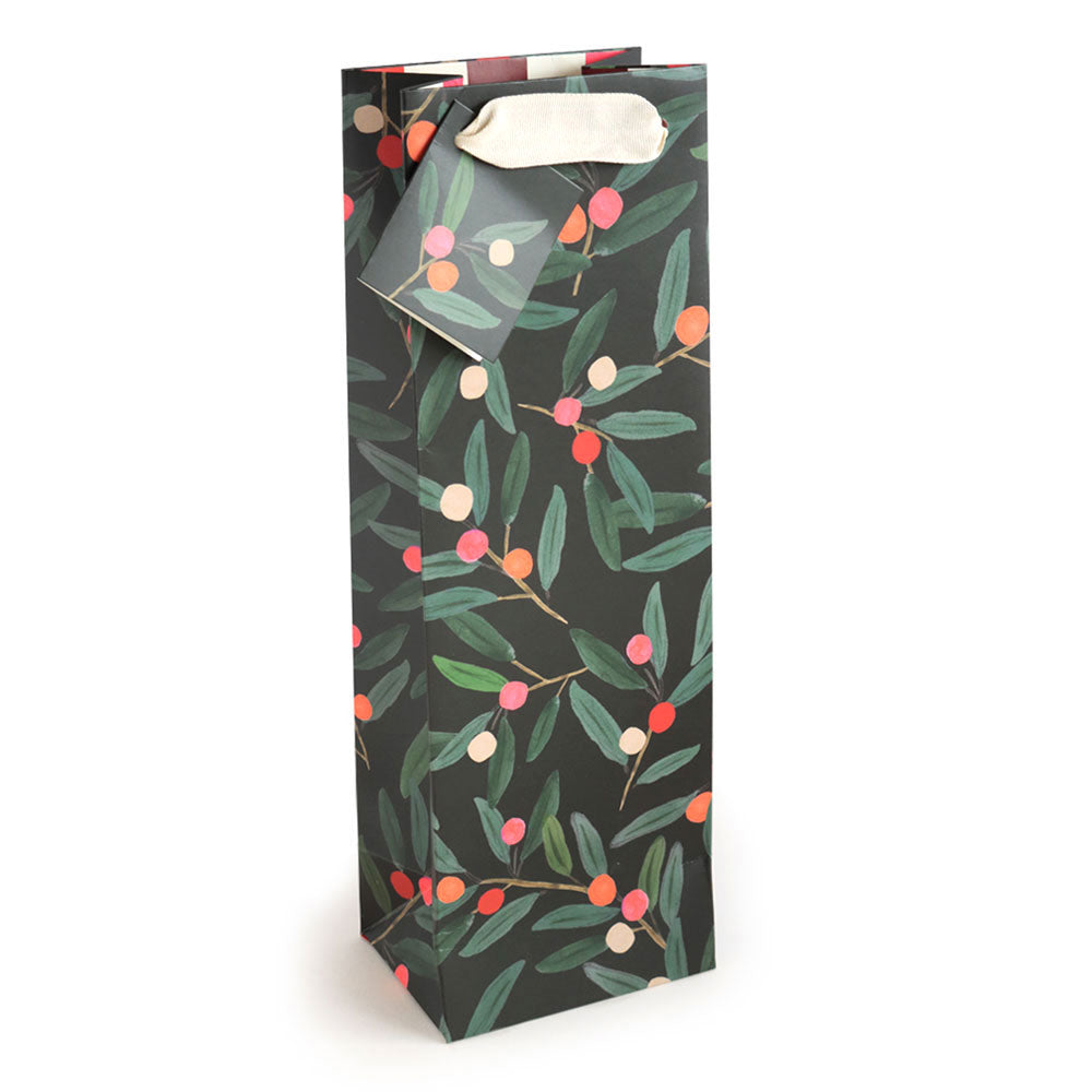 These bottle bags are made from thick paper, with a matt coating, finished with gold foil, a matching gift tag and cross grain ribbon.