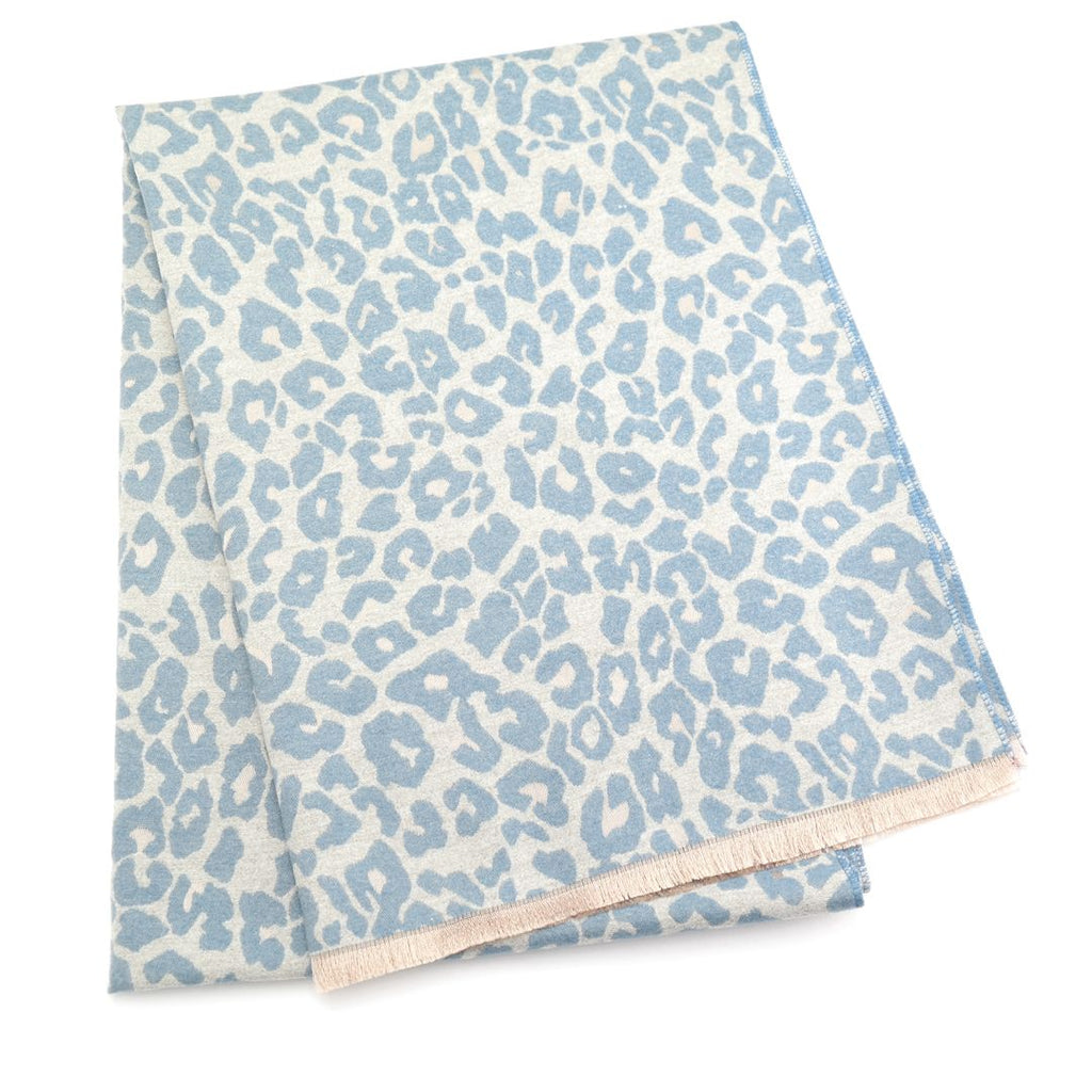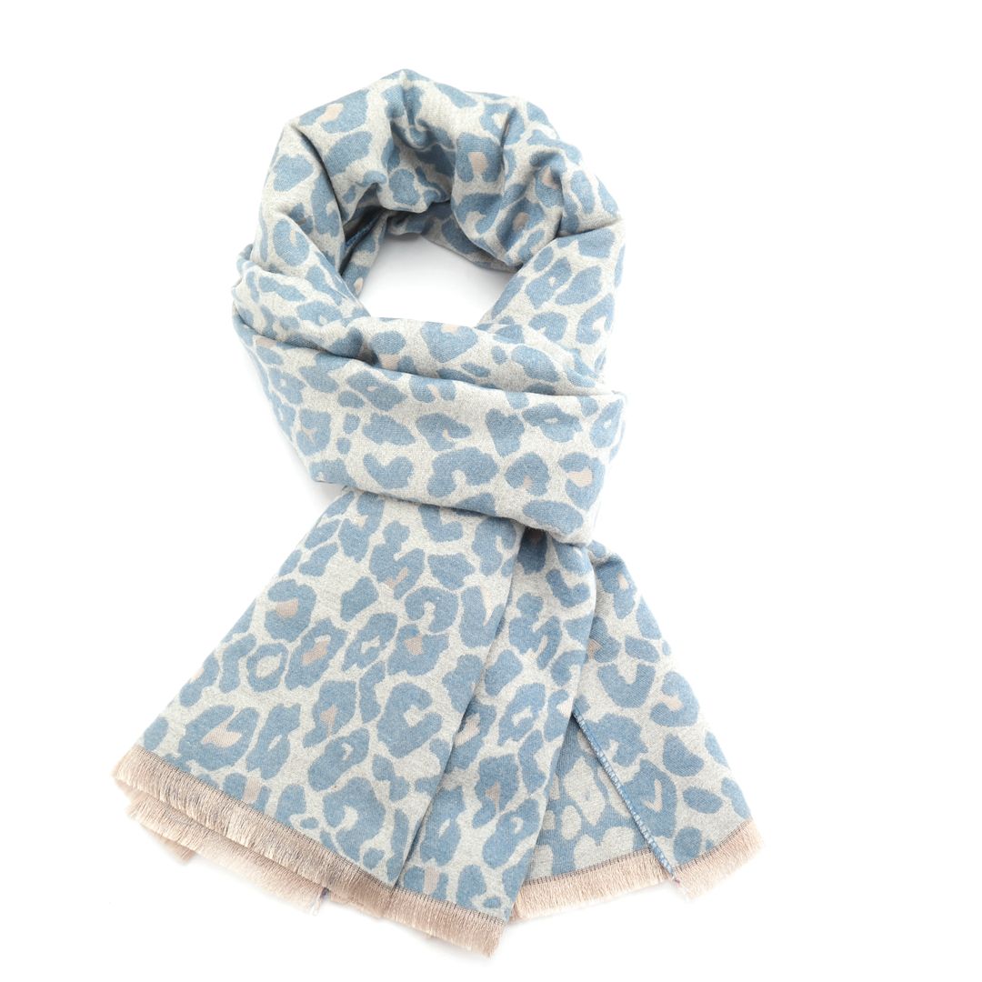 The Red Cuckoo Leopard Print Scarf in blue offers a stylish twist on classic warmth.