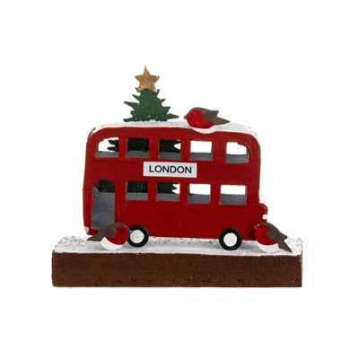 This standing decoration features a charming London bus with a Christmas tree on a block, perfect for bringing a touch of Christmas cheer to any room.