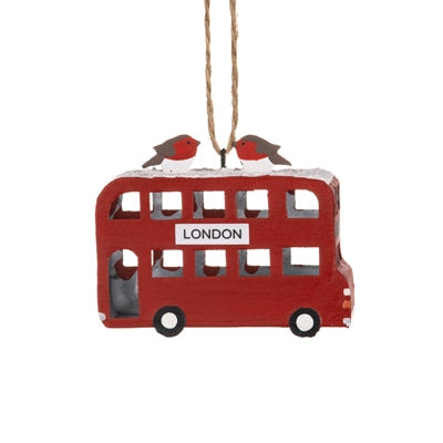 Add some festive cheer to your Christmas decor with this quirky Shoeless Joe London bus hanging decoration, featuring adorable Robins perched on top.