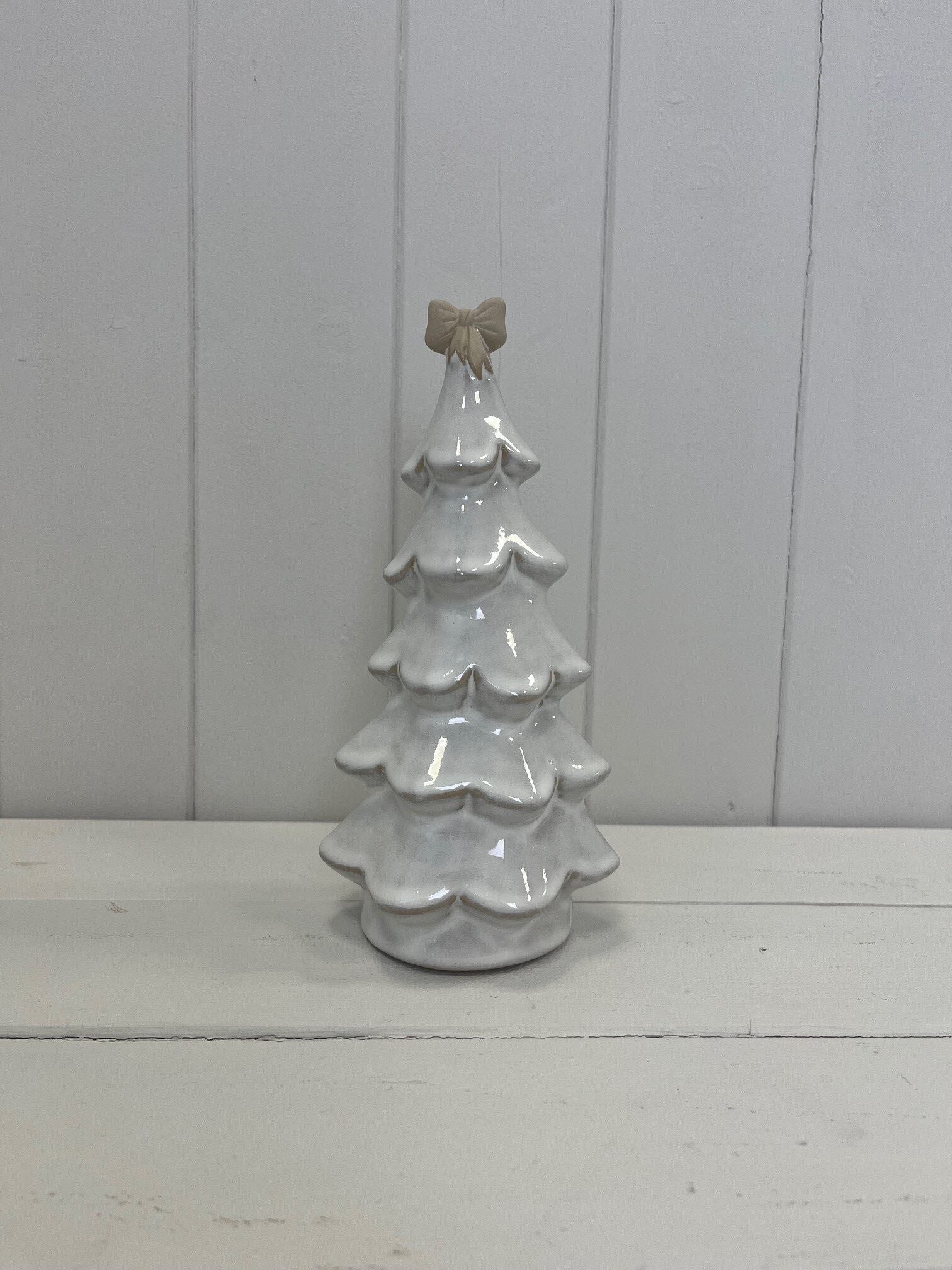 The Satchville Medium Stone Glazed Ceramic Tree with Bow offers a refined addition to your Christmas decorations.