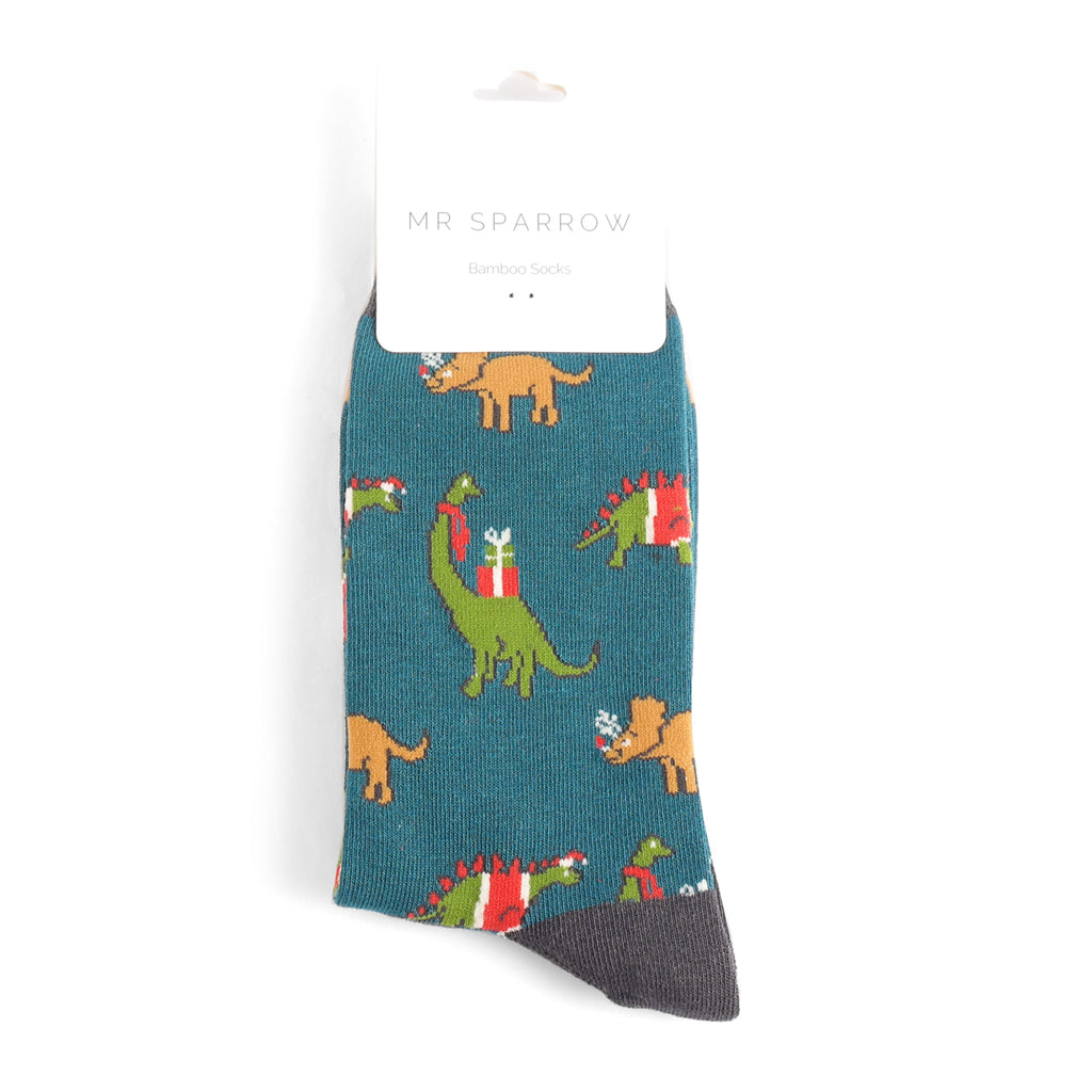 Mr Sparrow’s Jolly Jurassic Socks in teal offer a playful twist for men’s sock enthusiasts.