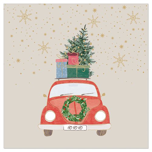 Upgrade your table with these festive napkins featuring a red car carrying a Christmas tree against a starry backdrop.