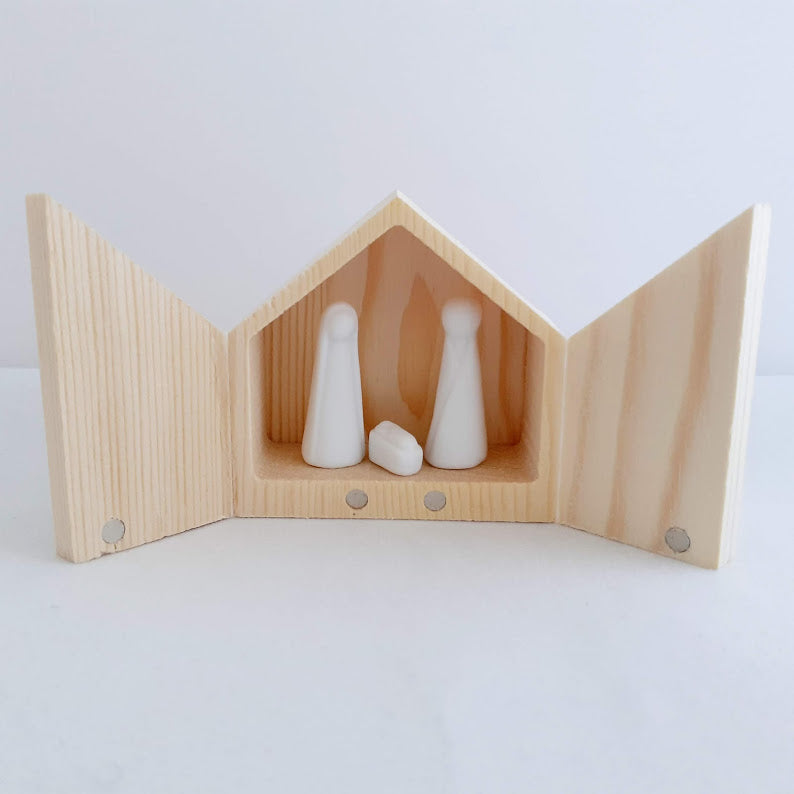 White porcelain Mary, Joseph and baby Jesus sit proudly in a laser-cut wooden box with silk paper and a magnetic fastener