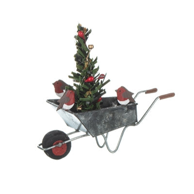 This festive decoration features robins perched on a wheel barrow, complete with a Christmas tree. Spread jolly vibes with this fun and unique piece.